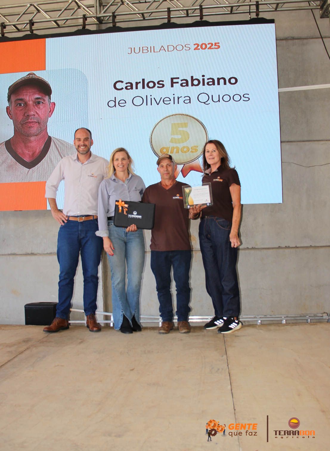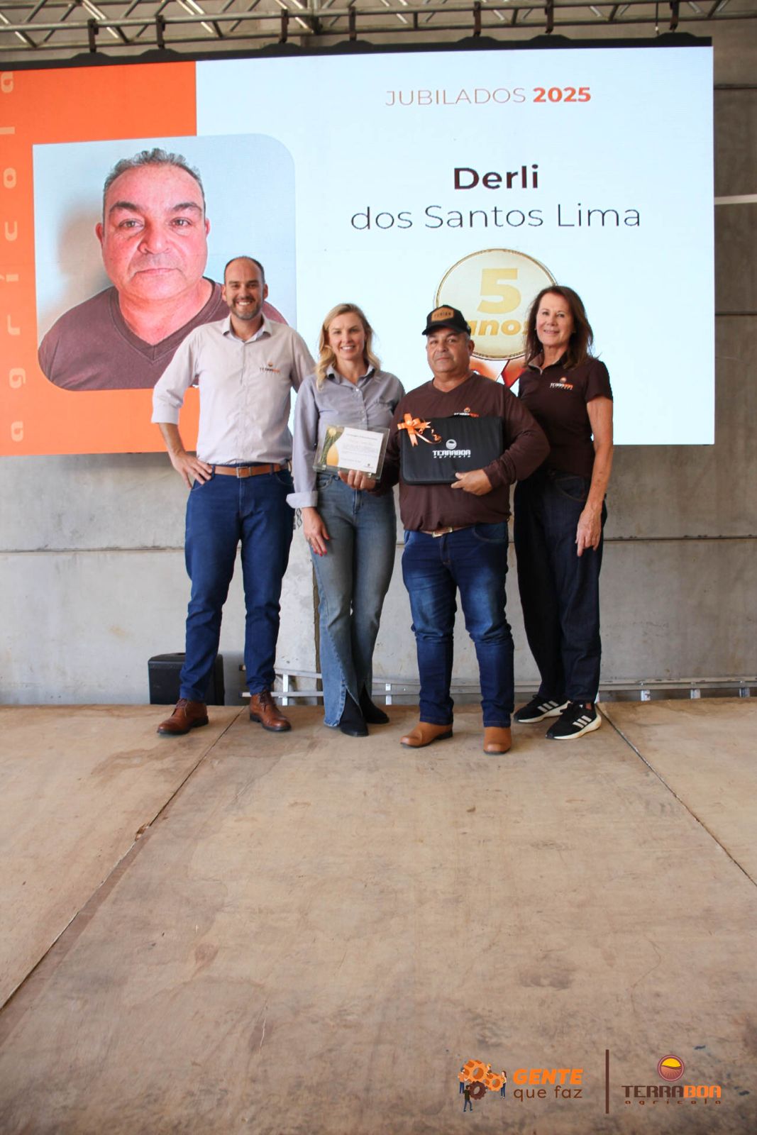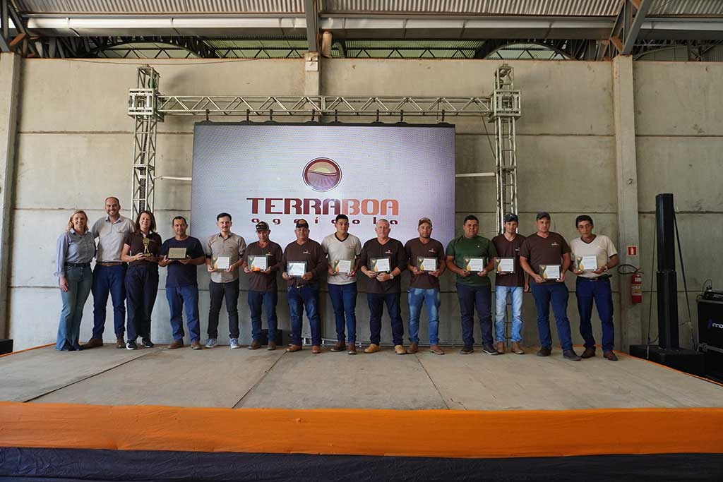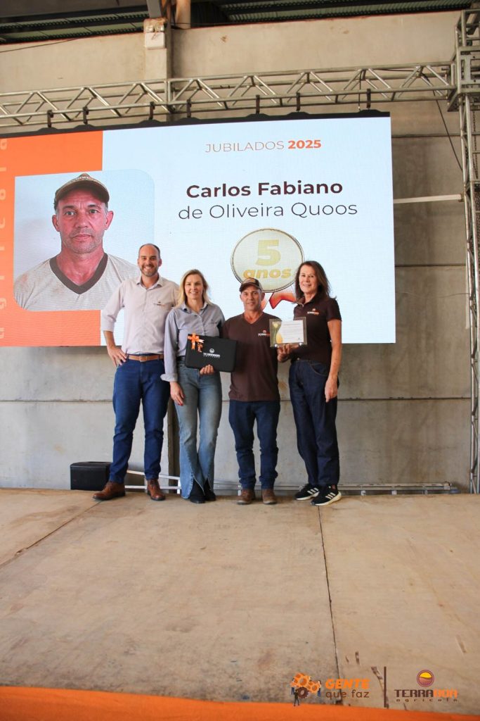 Na sequência, a Terra Boa Agrícola prestou homenagens especiais a colaboradores que se destacaram por sua dedicação e trajetória. Foram reconhecidos os jubilados de 5 e 10 anos de casa, reforçando o valor da permanência, do comprometimento e da construção de relações sólidas ao longo do tempo.